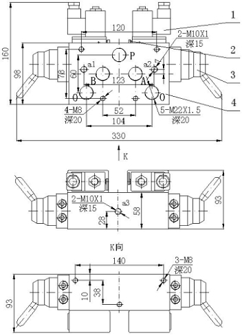 O---通往排氣口,&nb, sp; K向圖中的140(以中心線各70mm)、38的三個(gè)孔均為安裝固定的M8螺絲孔.