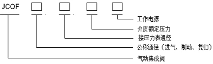 例1:JCQF-10-8-0.8-DC220表示氣制動(dòng)集成閥的公稱通徑為10mm,到壓力表的管內(nèi)徑為8mm,介質(zhì)額定壓力為0.8MPa,工作電源為直流DC220