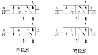 閥體兩端各有一個(gè)控制腔,兩個(gè)控制腔各有一個(gè)Φ2mm的先導(dǎo)孔與氣源壓力口(接口“P” )相通,氣源氣由先導(dǎo)閥來控制進(jìn)入控制腔(接口“A” )。當(dāng)一端線圈通電,磁力作用打開先導(dǎo)閥,氣源氣進(jìn)入該端控制腔(接口“A” ),推動(dòng)活塞帶動(dòng)閥芯,改變工作狀態(tài)。閥體有單穩(wěn)態(tài)和雙穩(wěn)態(tài)兩種,單穩(wěn)態(tài)閥線圈只有長期通電,電磁閥才能保持狀態(tài),一旦掉電,馬上復(fù)位。雙穩(wěn)態(tài)閥一旦線圈通電,閥位狀態(tài)改變后,即使掉電,仍保持現(xiàn)狀不變,只有當(dāng)一端線圈通電時(shí),閥位才會(huì)發(fā)生變化。