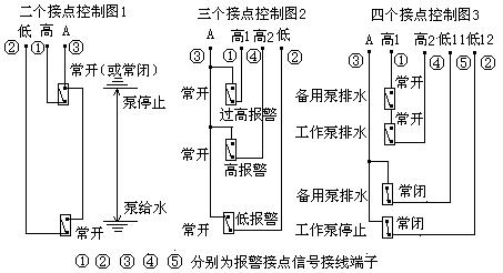 2)、二個報警信號:接點為常開,位置出廠設置在最高和最低位置;三個報警信號:均為常開,高2設在 50%,四個報警信號:高1高2為常開、低11低12為常閉,高2設在85%、低12設在15%,接線端見下圖,若有不同要求請說明,報警位置用戶也可自行調(diào)整。